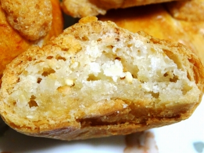 パイの上から中の餡に、胡麻とグラニュー糖、油脂を練り合わせた物が入っており、しっとりと少し柔らかく、ホクホクとした食感