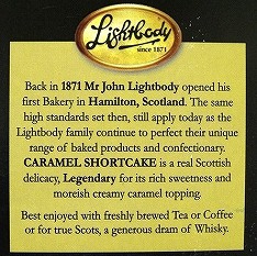 Back in 1871 Mr.John Lightbody opened his first Bakery in Hamilton, Scotland. The same high standards set then, still apply today as the Lightbody family continue to perfect their unique range of baked products and confectionery. CARAMEL SHORTCAKE is a real Scottish delicacy, Legendary for its rich sweetness and moreish creamy caramel topping. Best enjoyed with freshly brewed Tea or Coffee. |